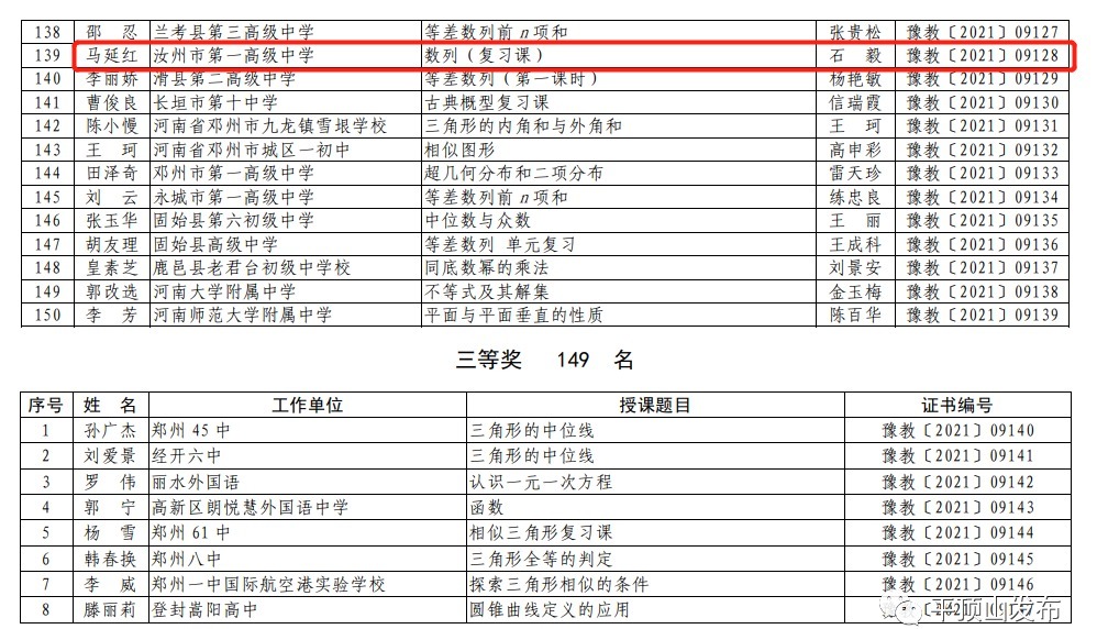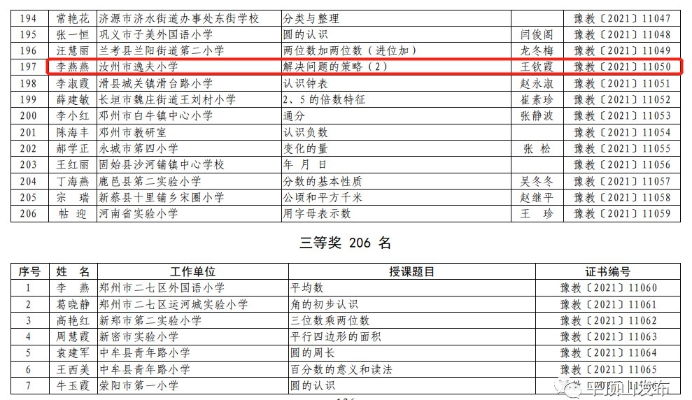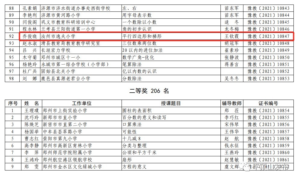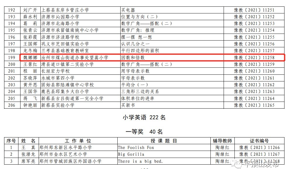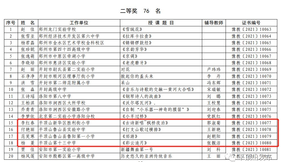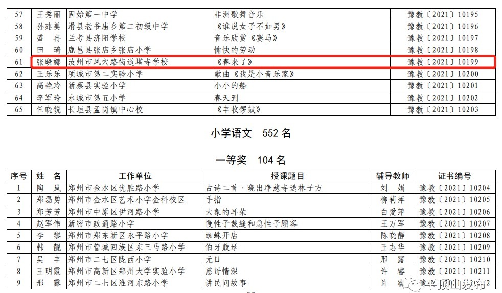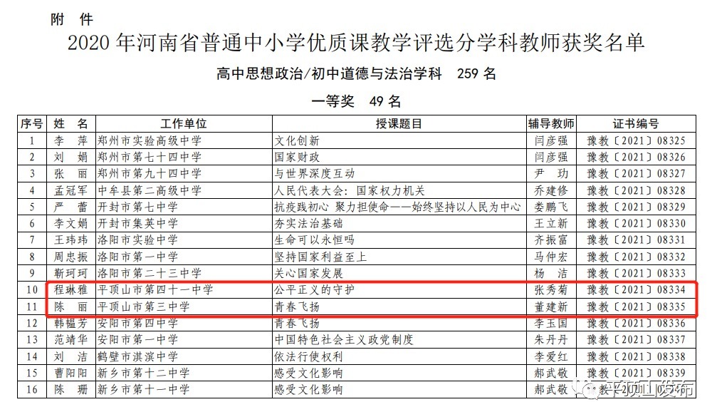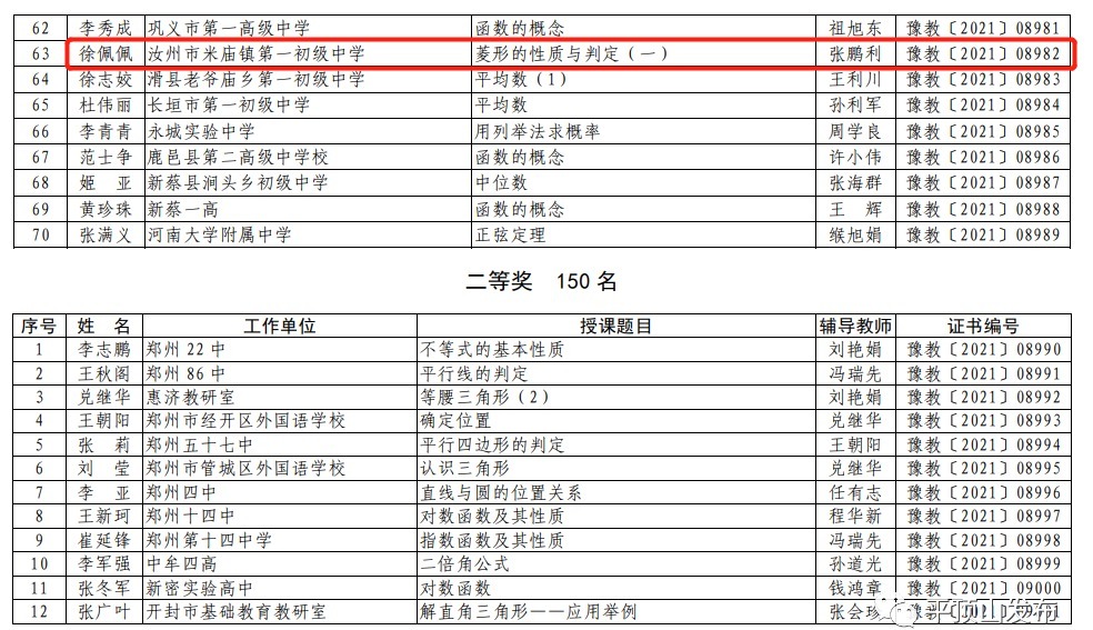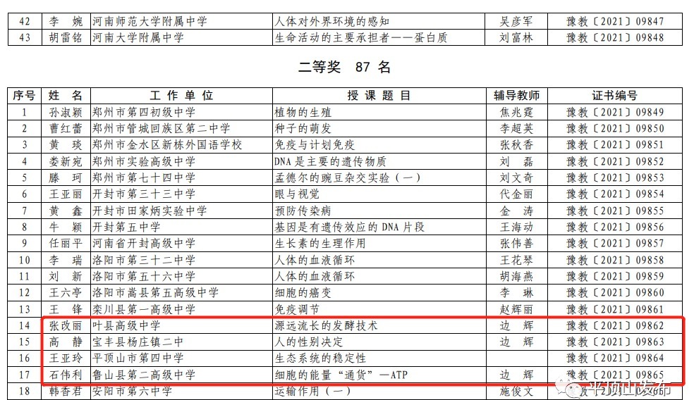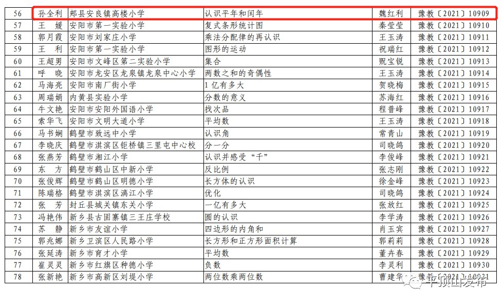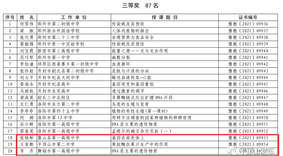 “2020年河南省普通中小学优质课教学评选分学科教师获奖名单”