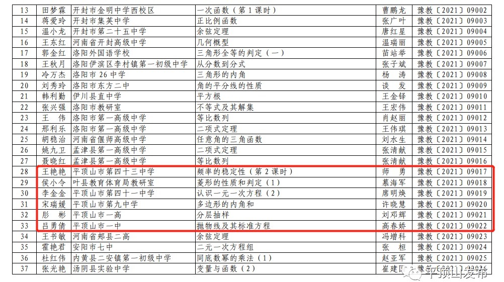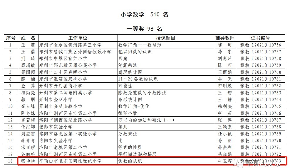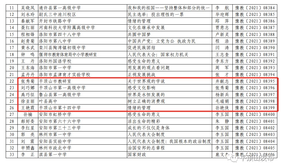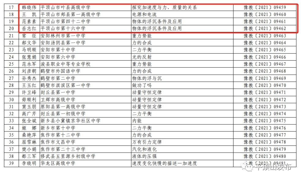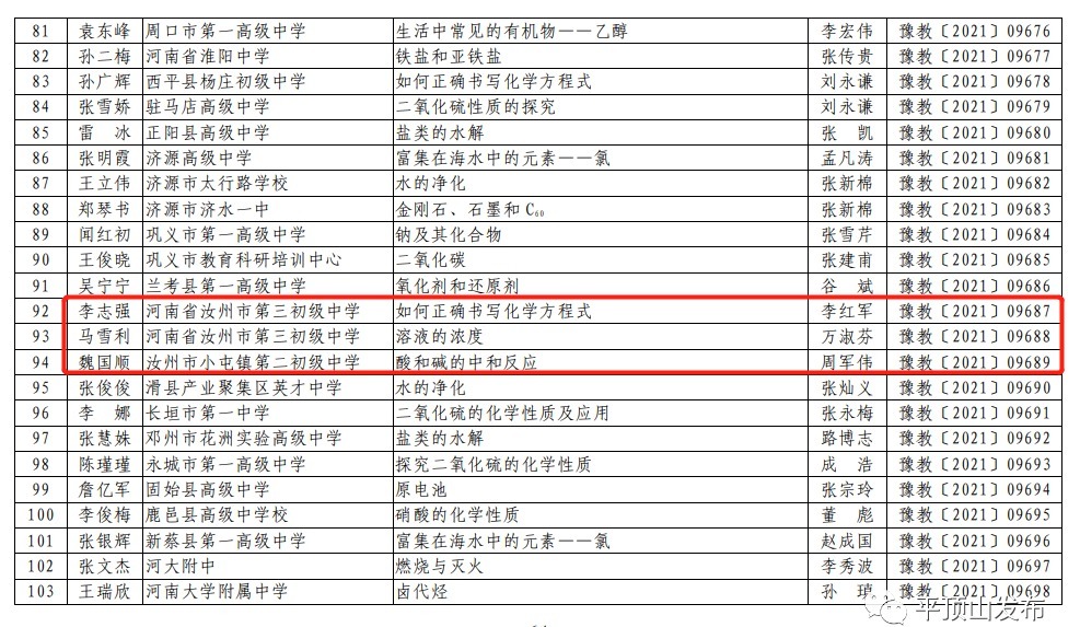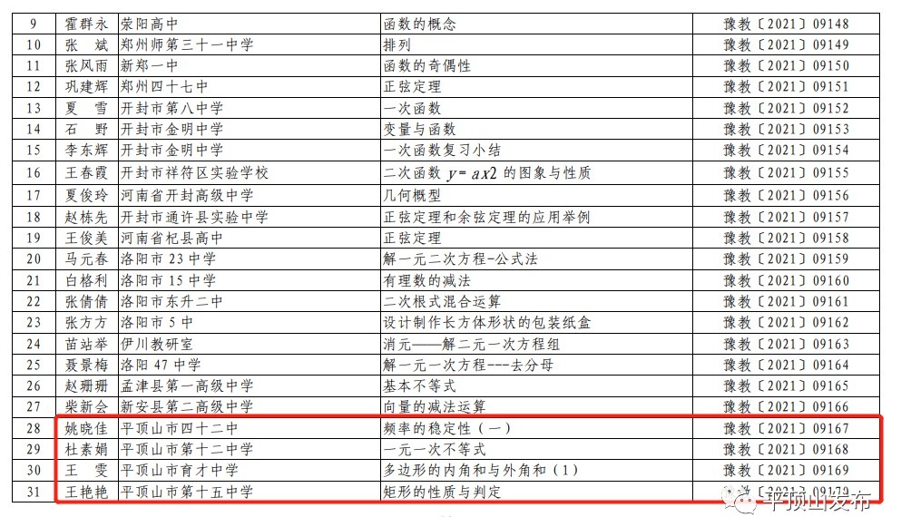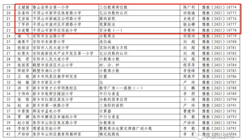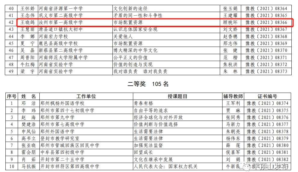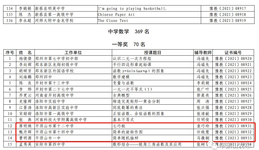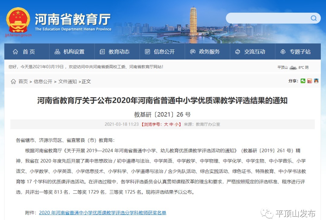 “2020年河南省普通中小学优质课教学评选分学科教师获奖名单”